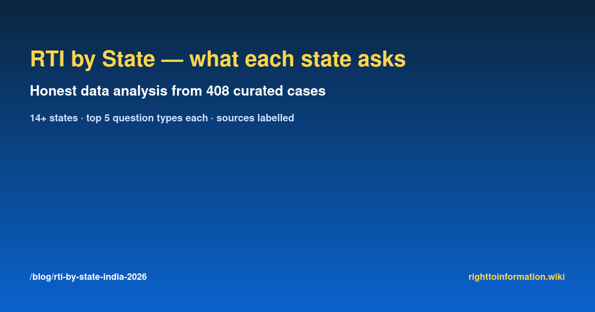 This post analyses RTI question patterns across Indian states using only sources we can name + verify. No scraped Google trends, no fabricated stats. The dataset is small (408 cases) and overweights cases that became visible enough to be curated — so treat each state's “top 5” as directional, not a population estimate. Where numbers are tiny (single-digit cases), we say so explicitly.