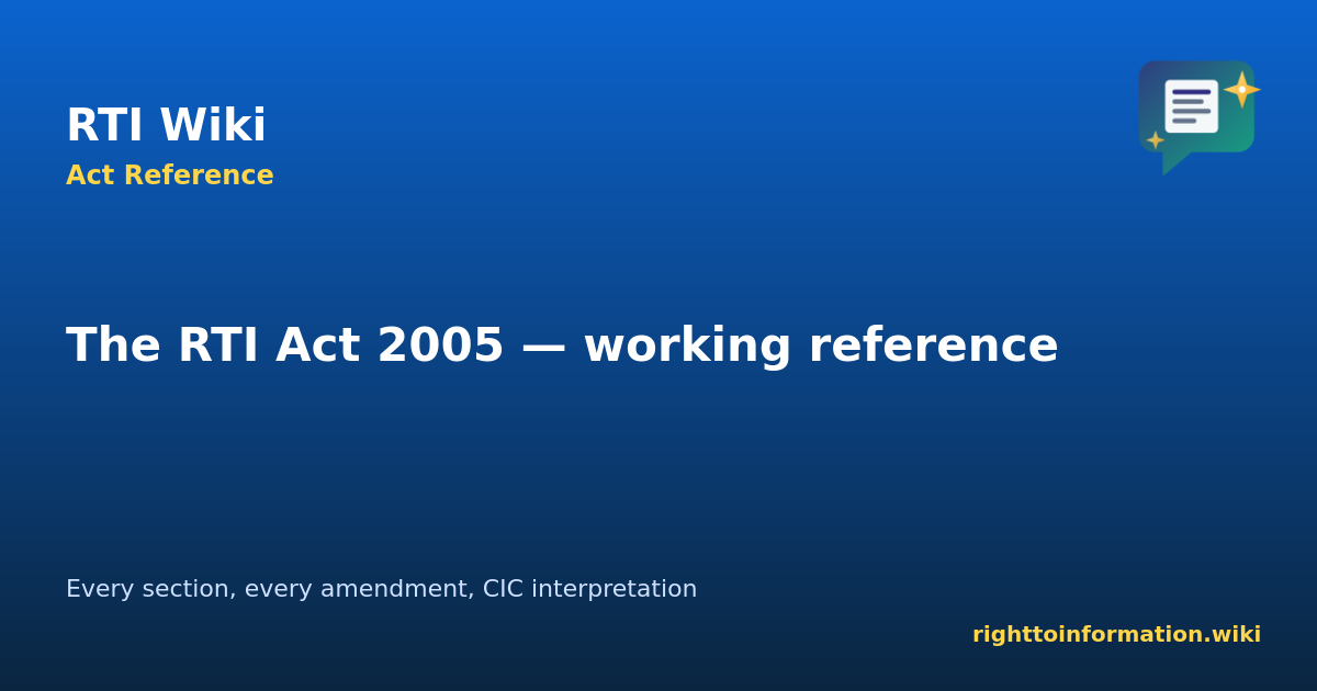 The Right to Information Act, 2005 (22 of 2005) empowers every Indian citizen to obtain information held by public authorities. This is the complete section-by-section text, amended through 14 November 2025 to incorporate the Digital Personal Data Protection Act, 2023 substitution of Section 8(1)(j), and the 2019 amendments to Sections 13, 16 and 27. Each section links to its leading judicial interpretation.