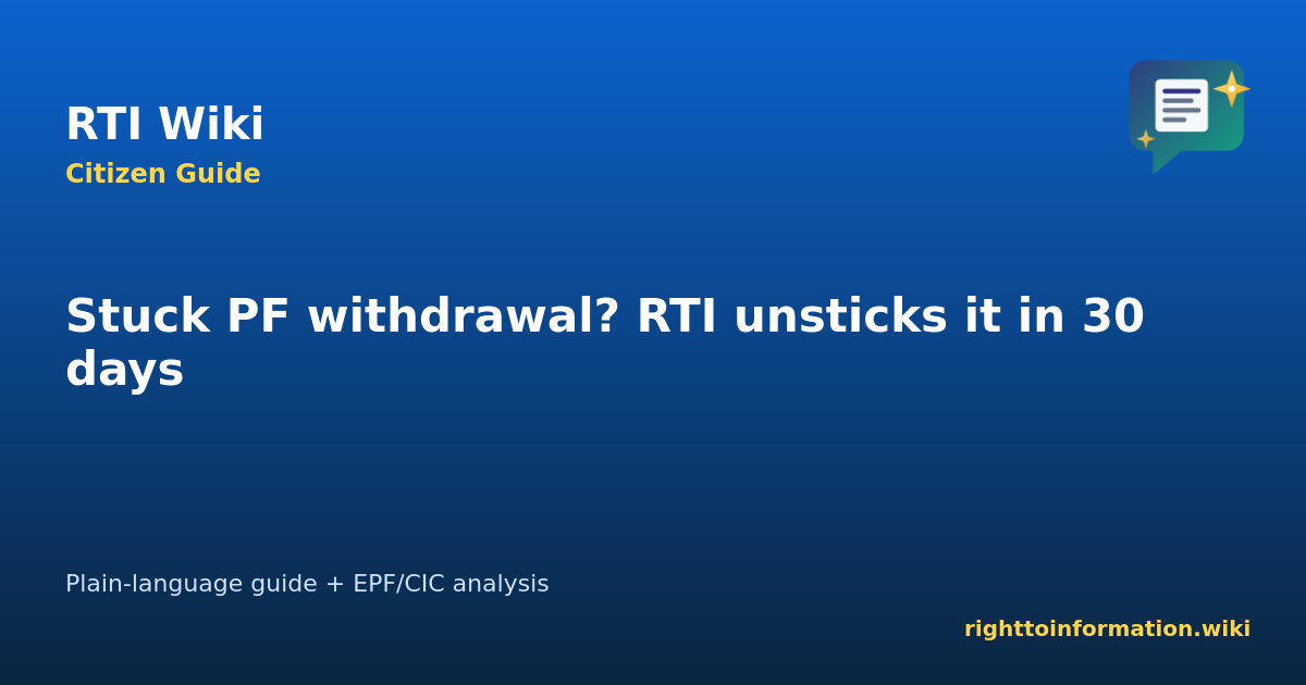 Plain-English summary. If your EPF withdrawal claim has been stuck for more than 20 days with no clear reason, you don't have to keep refreshing the EPFO portal in panic. The Right to Information Act, 2005 lets you ask the EPFO office (called RPFC) for a written explanation — for free — and they have to reply in 30 days. This page tells you exactly what to write, where to send it, and what to do next. No legal jargon. No fees.