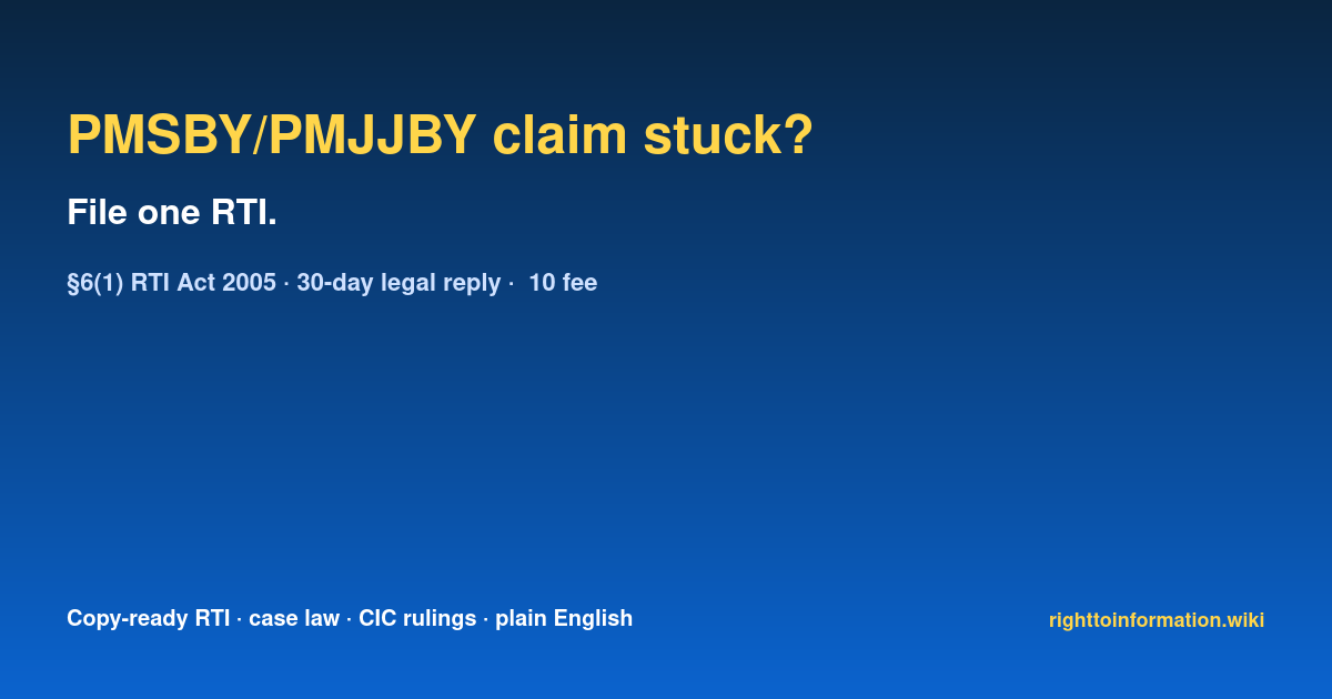 Short version. PMSBY (Pradhan Mantri Suraksha Bima Yojana — ₹2L accident, ₹20/yr) and PMJJBY (Pradhan Mantri Jeevan Jyoti Bima Yojana — ₹2L life, ₹436/yr) are micro-insurance schemes via PSBs/insurers. Claim SLA: 30 days. If stuck at bank or insurer, RTI to PIO of bank + insurer + IRDAI with ₹10 fee legally forces written reply within 30 days under §7(1) RTI Act 2005.